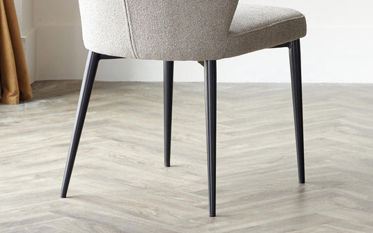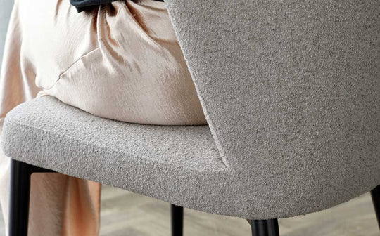 The Harper light grey boucle dining chair brings sophisticated comfort to your dining space with its soft curves and luxurious texture. The padded seat and gently curved backrest create an inviting place to linger over meals, while sleek black metal legs add contemporary contrast. Sold in pairs, these versatile chairs complement everything from modern glass tables to rustic wooden designs.