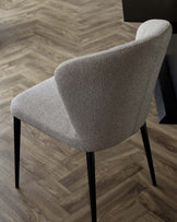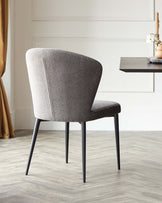Modern dining chair with a textured grey fabric upholstery and sleek black metal legs, positioned in a room with light hardwood flooring and complementary minimalist decor.
