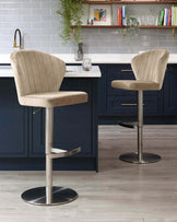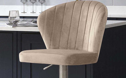 The Harper champagne velvet gas lift bar stool brings contemporary sophistication to your kitchen island or breakfast bar. Plush velvet upholstery in a soft champagne tone creates an inviting seat, while the brushed stainless-steel base adds modern polish. The smooth gas-lift mechanism adjusts from counter to bar height, and the 360-degree swivel makes conversation flow naturally.