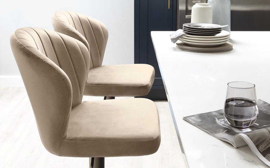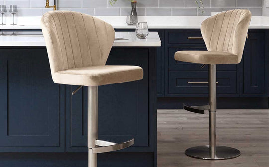 The Harper champagne velvet gas lift bar stool brings contemporary sophistication to your kitchen island or breakfast bar. Plush velvet upholstery in a soft champagne tone creates an inviting seat, while the brushed stainless-steel base adds modern polish. The smooth gas-lift mechanism adjusts from counter to bar height, and the 360-degree swivel makes conversation flow naturally.