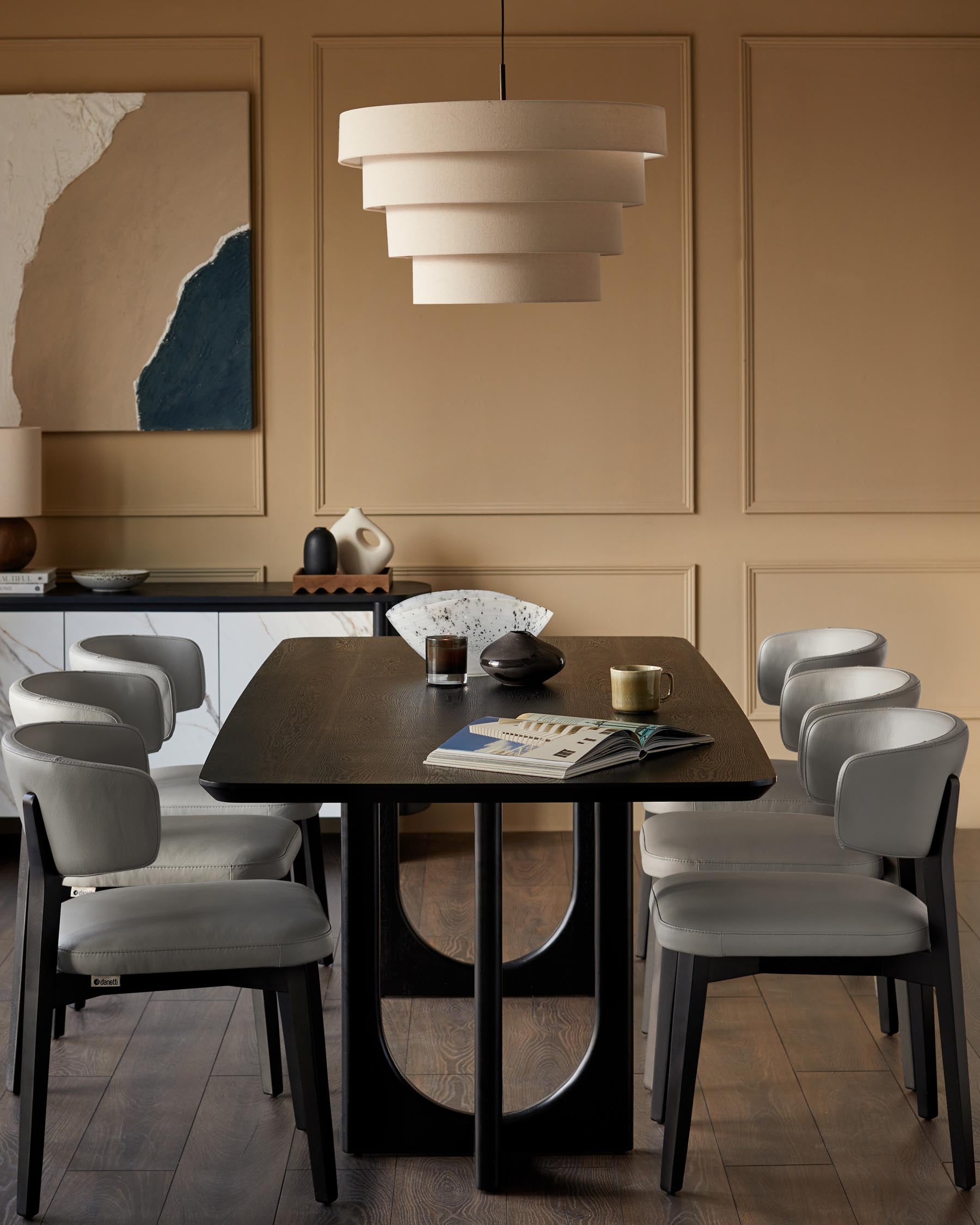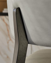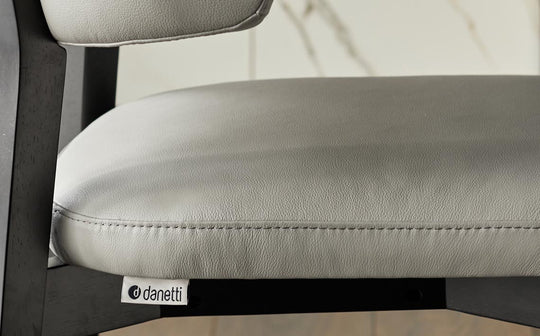 The Harris light grey leather dining chair brings understated sophistication to your dining space. Upholstered in genuine leather with a gracefully curved back for exceptional support, this chair combines comfort with style. The light grey leather contrasts beautifully with dark wooden legs, creating a timeless look that works with both contemporary and classic dining tables.