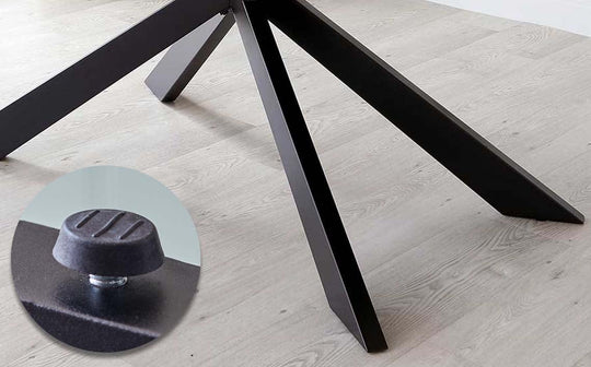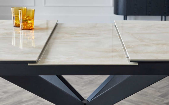 The Hayden Natural Ceramic extending dining table combines striking design with practical functionality. Its eye-catching starburst pedestal base in sleek black metal creates a contemporary focal point, while the natural ceramic top provides a sophisticated surface that extends from 6 to 8 seats. Perfect for both intimate dinners and larger gatherings, the clever sliding extension mechanism makes hosting effortless.
