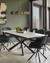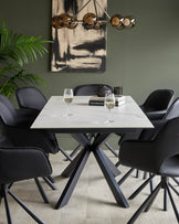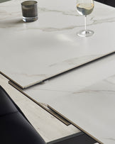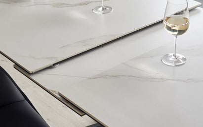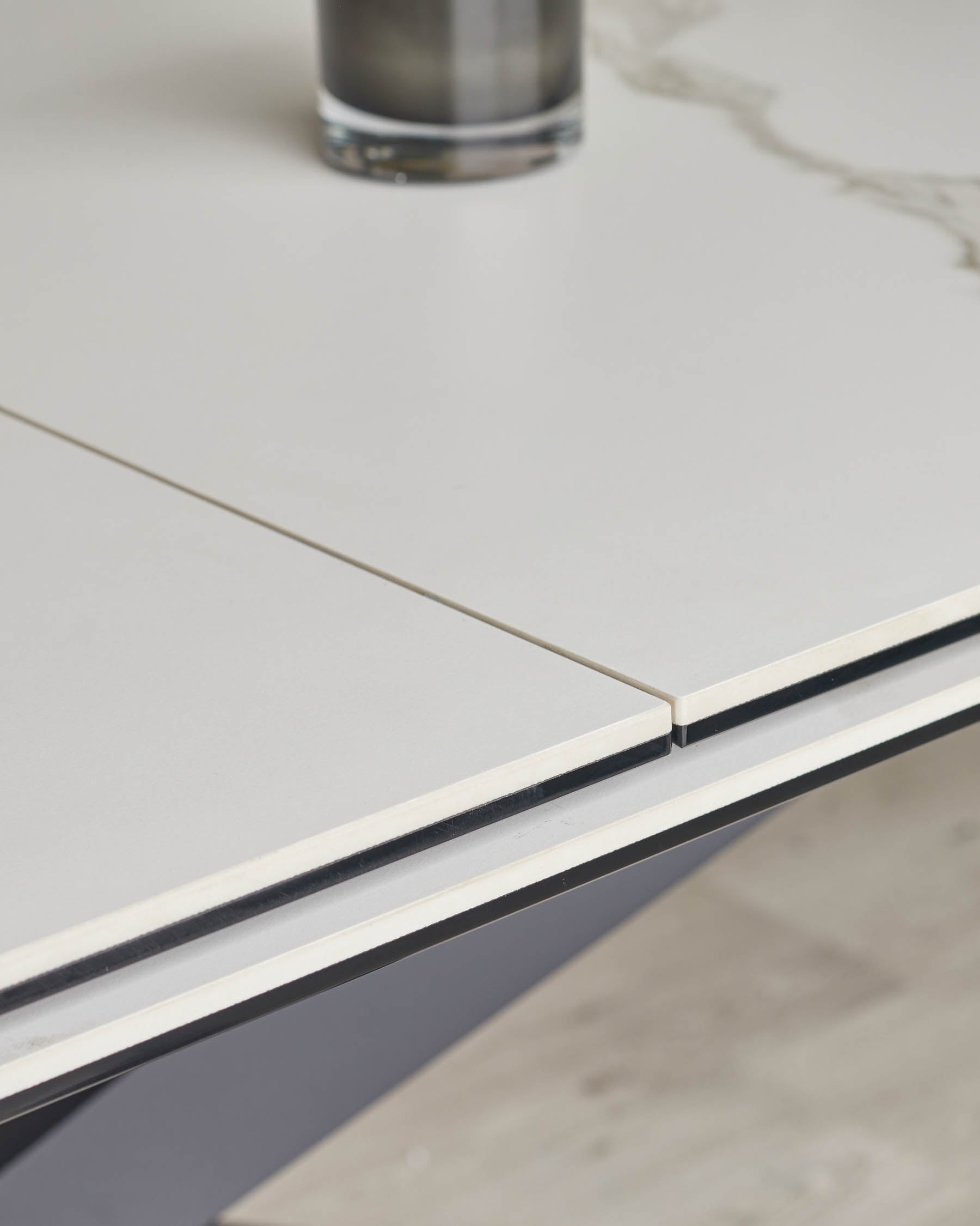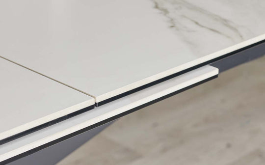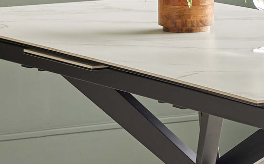 The Hayden white ceramic extending dining table brings sophisticated style and practical versatility to your dining space. Its striking starburst pedestal base supports a resilient ceramic top that extends smoothly from 8 to 10 seats, perfect for everything from weeknight dinners to weekend entertaining. The heat and scratch-resistant surface handles real life beautifully, while the bold architectural base makes every meal feel special.