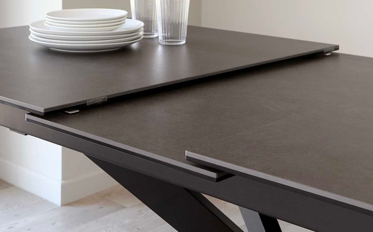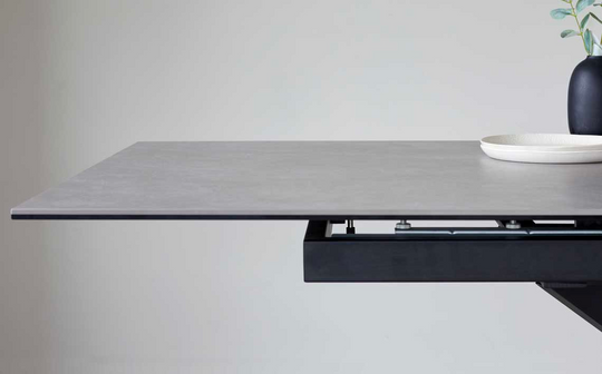 The Hayden dark grey ceramic extending dining table brings contemporary sophistication to your dining space. Its sleek ceramic top resists scratches and heat, making it perfect for both everyday meals and dinner parties. The distinctive starburst pedestal base creates an architectural focal point, while the smooth extending mechanism effortlessly accommodates 6 to 8 guests when extra space is needed.