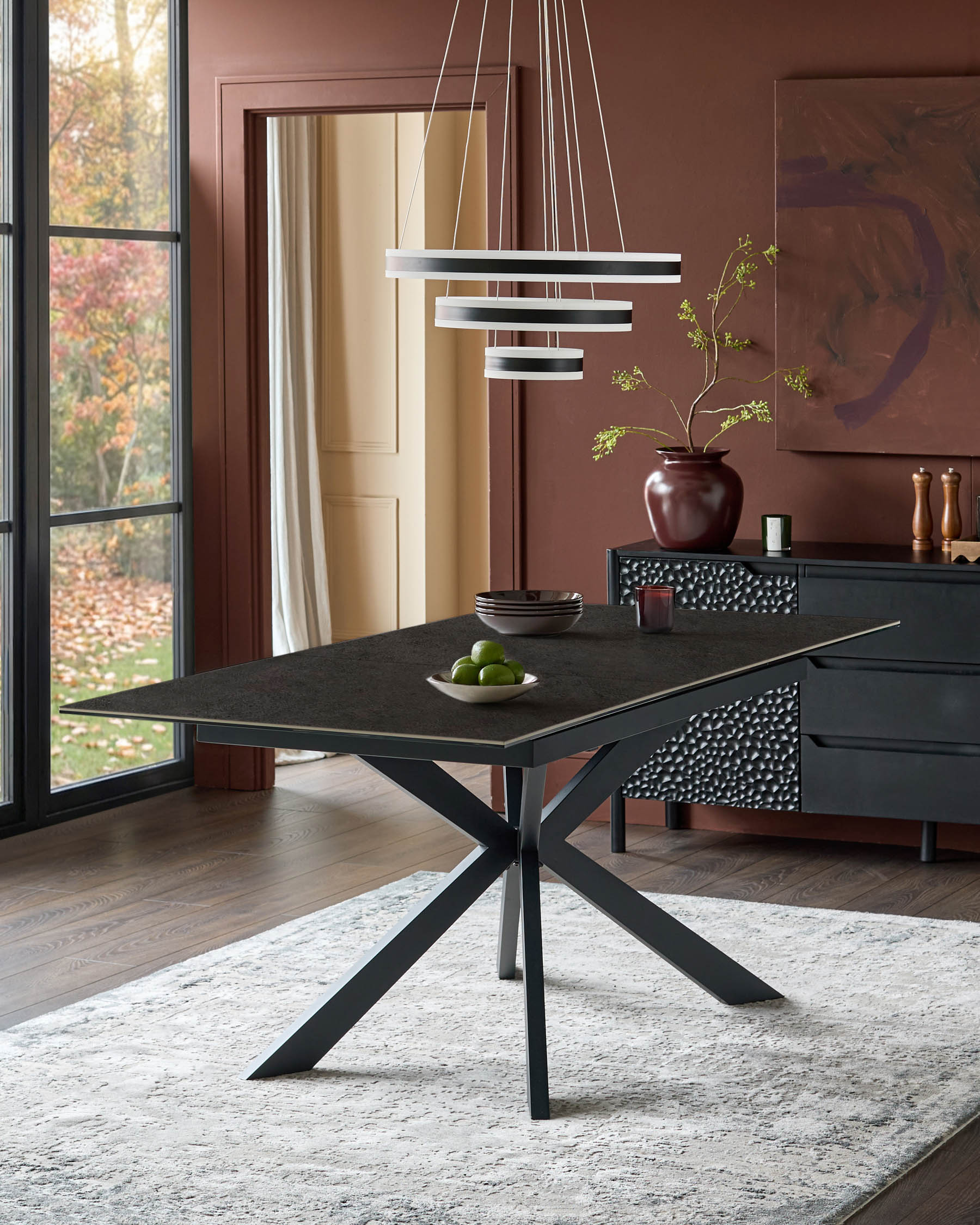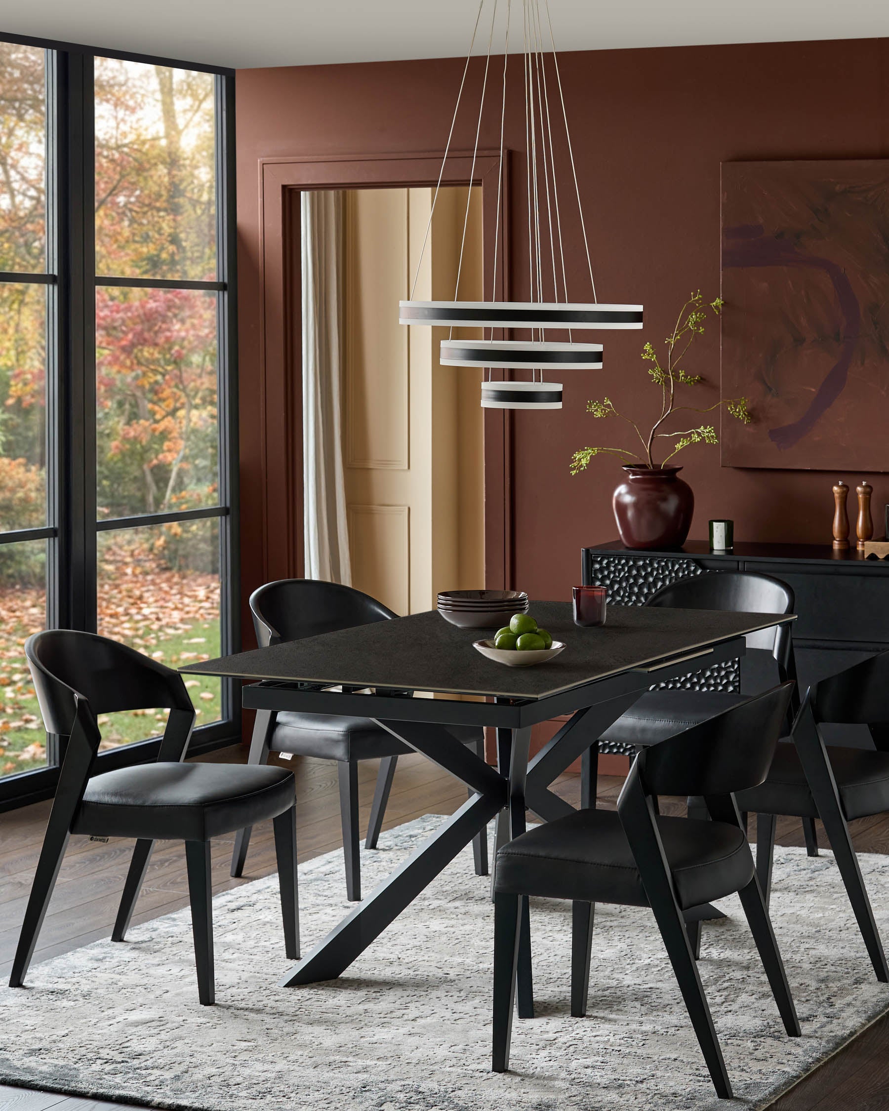 The Hayden dark grey ceramic extending dining table brings contemporary sophistication to your dining space. Its sleek ceramic top resists scratches and heat, making it perfect for both everyday meals and dinner parties. The distinctive starburst pedestal base creates an architectural focal point, while the smooth extending mechanism effortlessly accommodates 6 to 8 guests when extra space is needed.