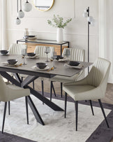 The Hayden Light Grey Ceramic extending dining table brings contemporary style and practical versatility to your dining space. Its smooth ceramic top resists scratches and heat while the distinctive starburst pedestal base creates visual impact. Extending from 6 to 8 seats with a simple sliding mechanism, it's perfect for both intimate dinners and larger gatherings.