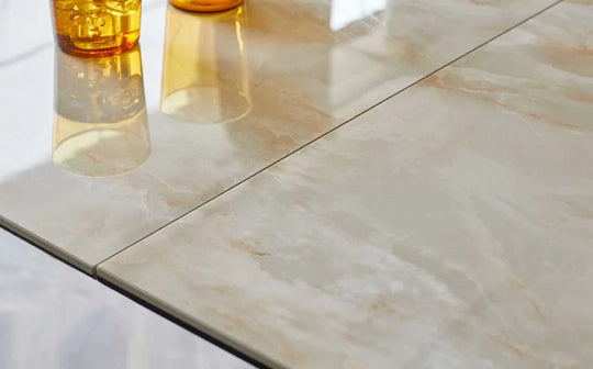 The Hayden 6-8 seater natural ceramic dining table with 6 Harper champagne velvet chairs creates the perfect setting for memorable meals. The scratch-resistant ceramic top handles everything from morning coffee to dinner parties, while the clever extending mechanism adds two extra seats when needed. With its striking starburst leg design and plush velvet seating, this set makes every gathering feel special.