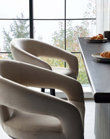 Elegant modern dining chairs with a curved back design, upholstered in a light beige fabric, paired with a contemporary dark table with a fluted texture on its side panel, in a bright room with a large window showcasing a natural view.
