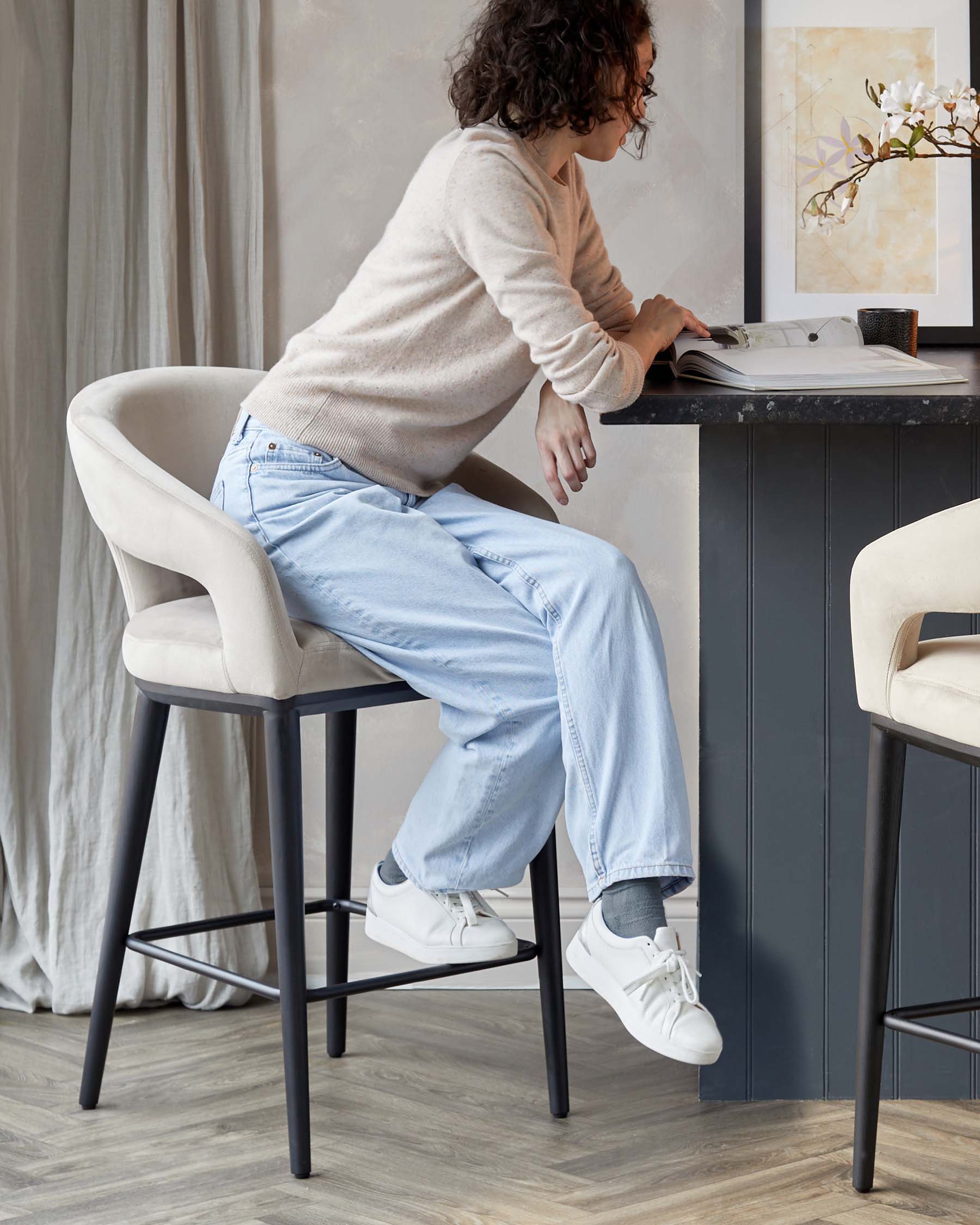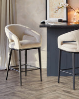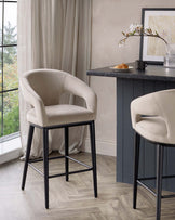 Elegant contemporary bar stools with plush beige velvet upholstery and a curved backrest, featuring sleek black metal legs with a geometric footrest design.
