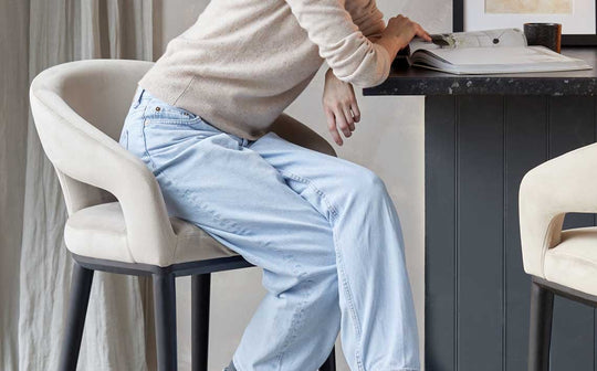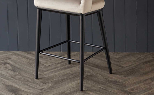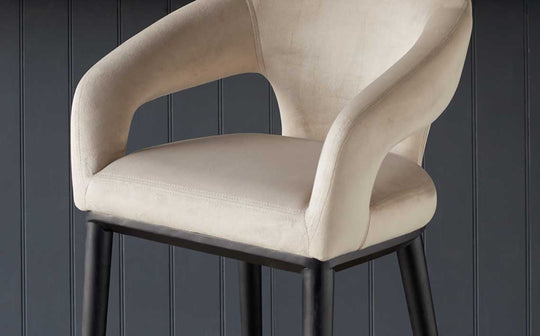 The Heath champagne plush velvet bar stool brings luxurious comfort to your breakfast bar or kitchen island. With its generous seat, high supportive back and elegantly scooped arms, this fixed-height stool makes morning coffee or evening cocktails a pleasure. The soft champagne velvet upholstery paired with dark ash wood legs creates a sophisticated look that works beautifully in contemporary kitchens.