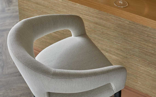 The Heath ivory dual tone fabric bar stool brings refined comfort to your kitchen island or breakfast bar. Upholstered in smooth woven fabric with an ivory and white dual-tone design, it features a curved backrest and generously padded seat for exceptional support. The black ash wood legs and adjustable floor protectors ensure lasting stability.