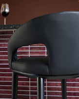 The Heath black faux leather bar stool brings sophisticated seating to your kitchen island or breakfast bar. With its wraparound backrest and open detailing, this counter-height stool combines comfort with contemporary style. The smooth black upholstery pairs beautifully with solid black wood legs, creating a timeless look that works in both modern and traditional spaces.