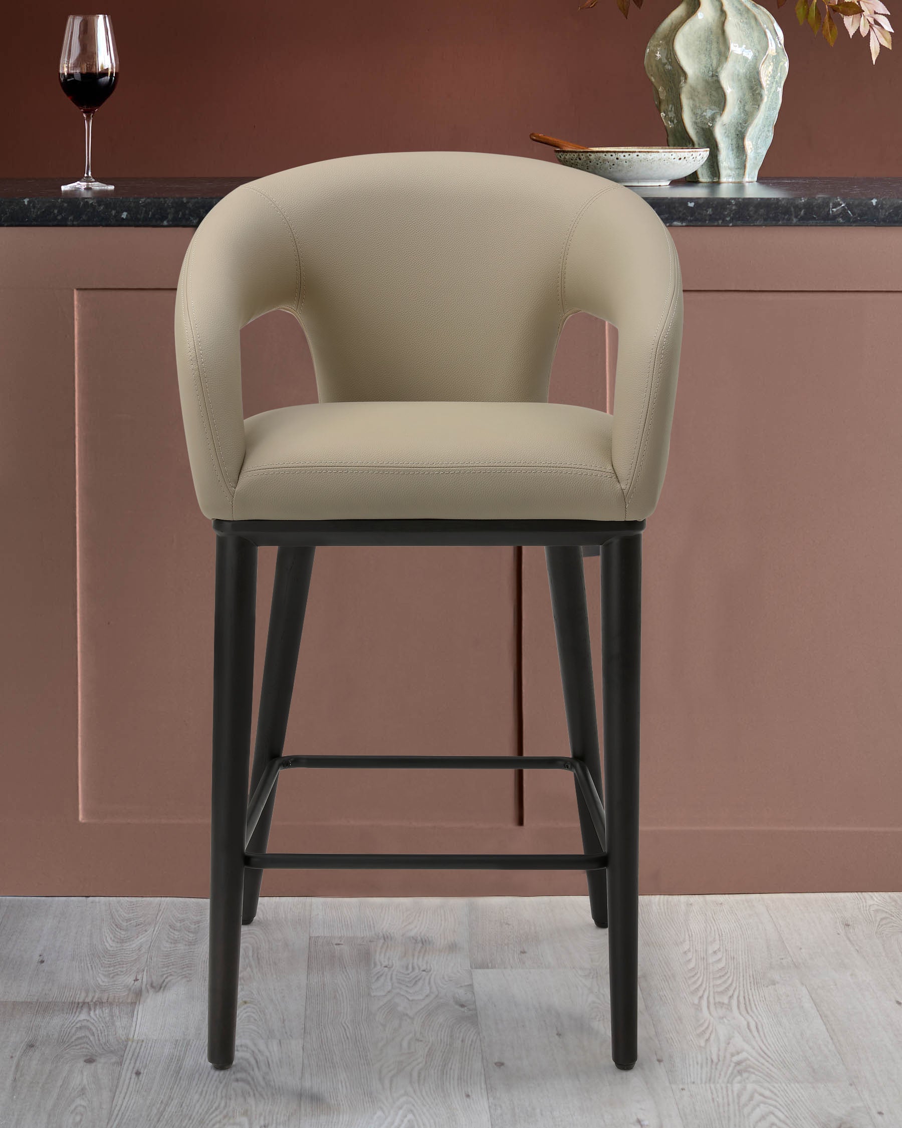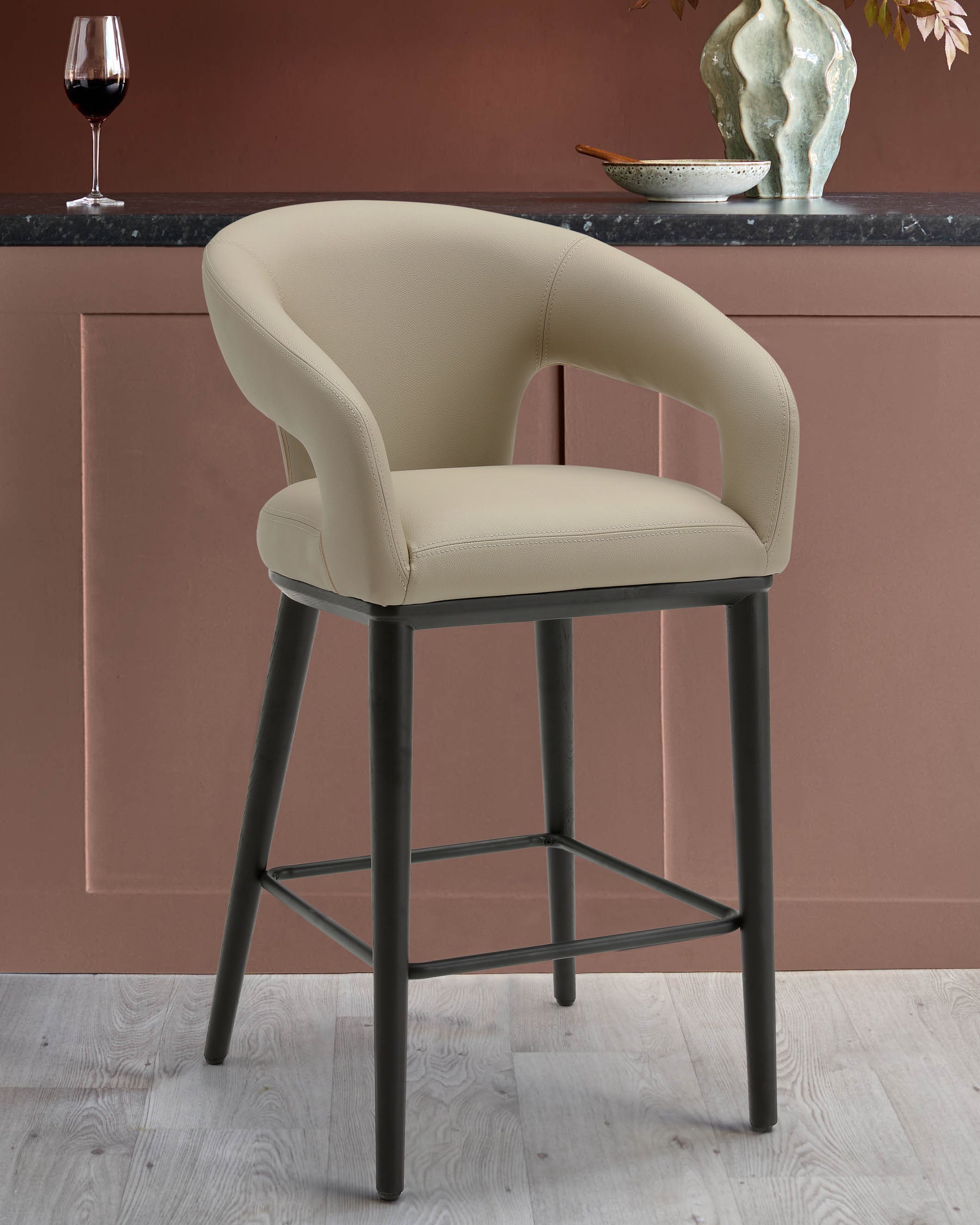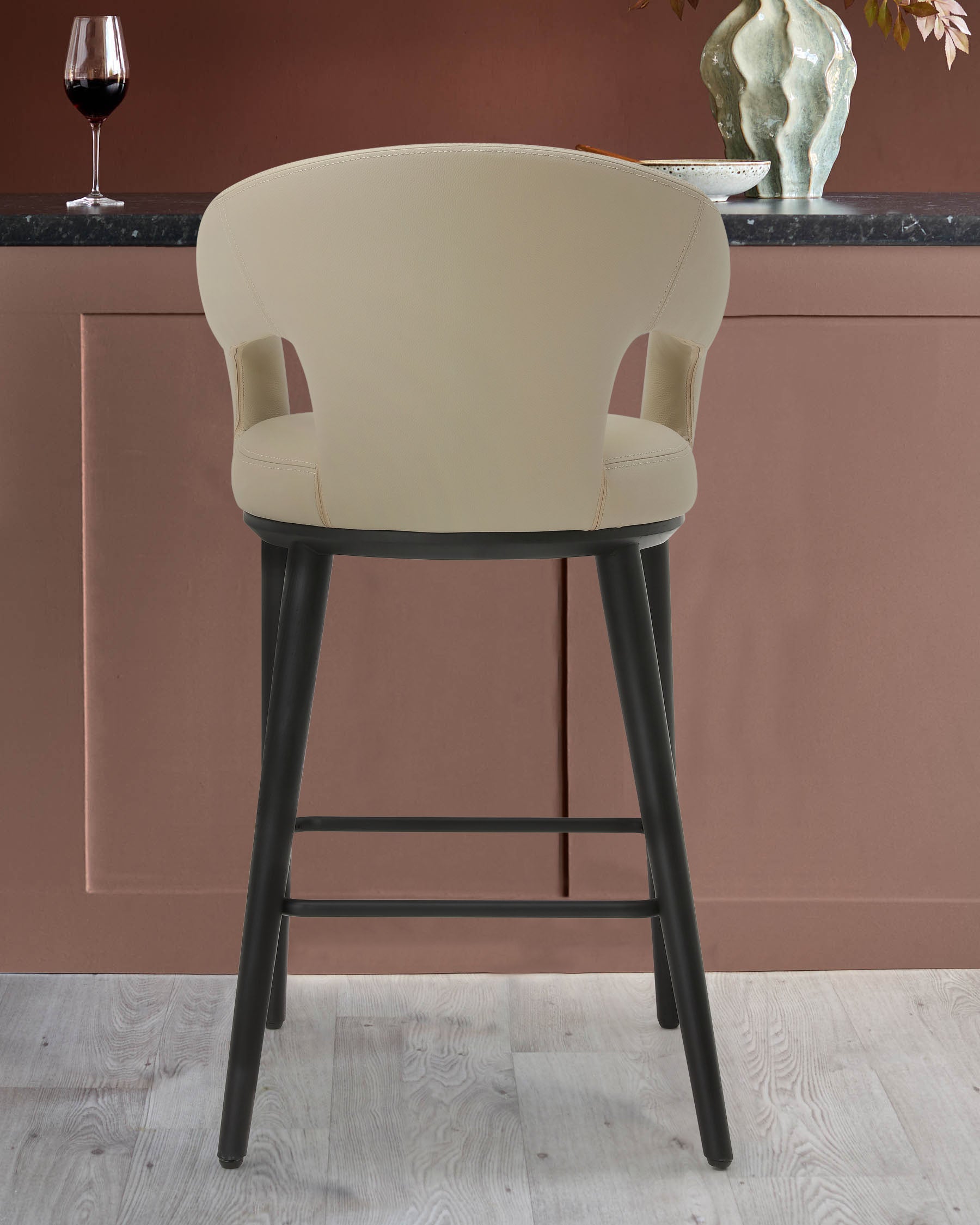 The Heath natural faux leather bar stool brings refined comfort to your kitchen counter or breakfast bar. Upholstered in cream-toned Durosoft faux leather that exceeds industry standards for durability, this beautifully proportioned stool features a wraparound backrest with subtle open detailing. Four solid black wood legs with adjustable floor protectors ensure stability whilst protecting your floors.