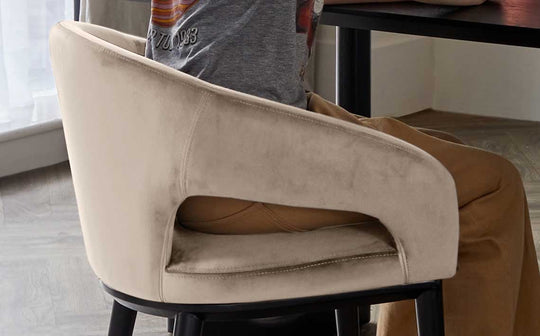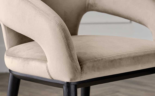 Thoughtfully designed for those long, leisurely dinners that turn into late-night conversations, the Heath champagne velvet dining chair brings comfort and sophistication to your table. With its generous proportions, high supportive back and elegantly scooped arms, this is where memorable gatherings begin. The luxurious champagne velvet upholstery adds warmth whilst sleek black wood legs provide a striking contrast.