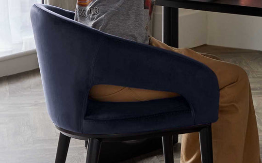 Thoughtfully designed for comfort and crafted from luxurious recycled velvet, the Heath navy dining chair brings sophisticated style to every gathering. Its gently scooped arms and supportive backrest make long dinner parties a pleasure, while the rich navy upholstery adds depth and elegance to your dining space.