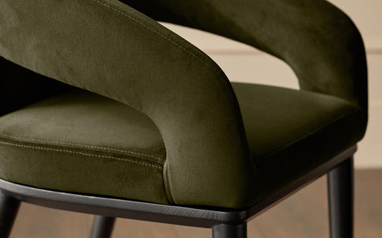 The Heath olive green velvet dining chair brings sophisticated comfort to your dining space. Upholstered in luxurious recycled velvet, this exclusively designed chair features a distinctive wraparound backrest with subtle open detailing. Four solid dark wood legs provide sturdy support, while the rich olive tone adds warmth to both formal dining rooms and casual kitchen spaces.