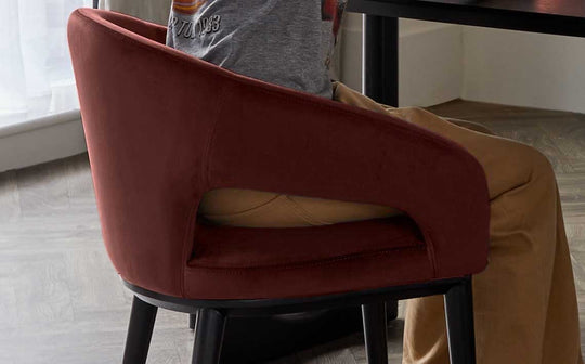 Make every meal memorable with the Heath toffee red velvet dining chair. Its scooped arms and curved backrest create a cocoon of comfort, perfect for those dinner parties that stretch into the night. The rich toffee red recycled velvet brings warmth and sophistication to your dining space, while sturdy black hardwood ash legs promise strength that stands up to real life.