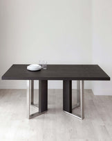 With its on-trend, rich dark oak finish and modern metallic accents, the Jonah dining table makes a stylish statement. The contemporary shape and detailing create a focal point in any dining space. Styled in a high-quality wood finish, this table features a striking brushed stainless steel cross-shaped base, adding a touch of industrial chic. The rectangular top offers ample space for up to 6 guests, making it perfect for family meals and dinner parties. Style the Jonah dining table with sleek upholstered dining chairs for a contemporary look, or opt for more traditional wooden or metal framed chairs for an eclectic feel. A statement pendant light above will create a warm ambience.Details
