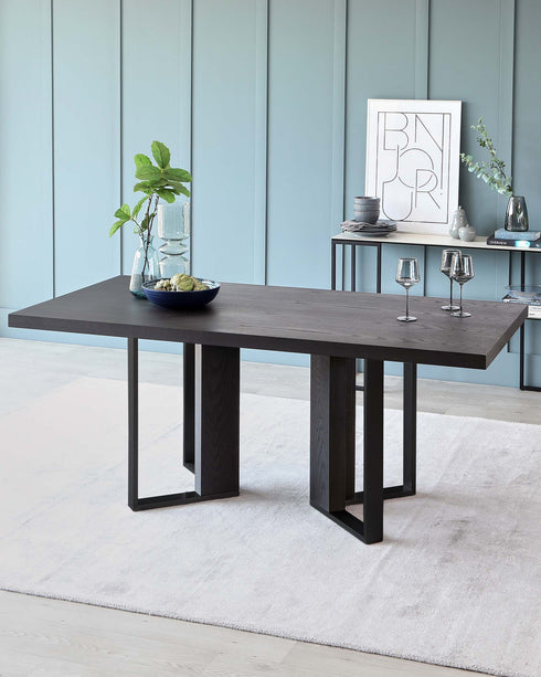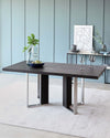 With its on-trend, rich dark oak finish and modern metallic accents, the Jonah dining table makes a stylish statement. The contemporary shape and detailing create a focal point in any dining space. Styled in a high-quality wood finish, this table features a striking brushed stainless steel cross-shaped base, adding a touch of industrial chic. The rectangular top offers ample space for up to 6 guests, making it perfect for family meals and dinner parties. Style the Jonah dining table with sleek upholstered dining chairs for a contemporary look, or opt for more traditional wooden or metal framed chairs for an eclectic feel. A statement pendant light above will create a warm ambience.Details
