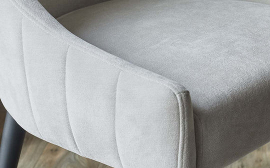 The Juliana natural grey fabric dining chair brings comfort and style to every meal. Upholstered in soft chenille fabric with a gently curved backrest, these chairs invite long dinners and lively conversations. The cushioned seat provides exceptional comfort, while black powder-coated metal legs create a striking contrast. A practical handle on the chair back makes repositioning effortless. Sold in pairs.