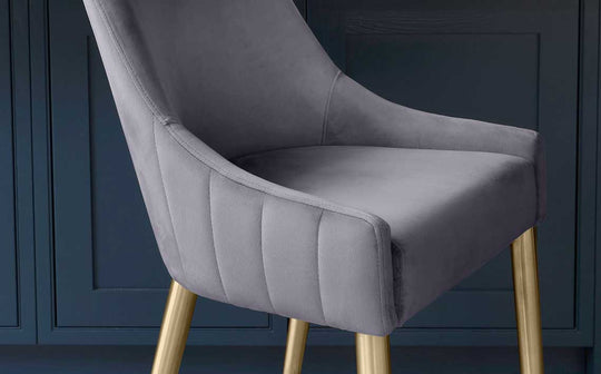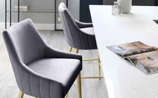 The Juliana bar stool brings sophisticated style to your kitchen counter or breakfast bar. Upholstered in sumptuous dark grey velvet with subtle textured detailing, it features elegant curved lines and a practical horizontal bar handle for easy positioning. The brushed brass legs add a glamorous touch, while the fixed height design ensures stable, comfortable seating for everyday dining and entertaining.