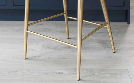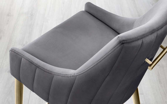 The Juliana bar stool brings sophisticated style to your kitchen counter or breakfast bar. Upholstered in sumptuous dark grey velvet with subtle textured detailing, it features elegant curved lines and a practical horizontal bar handle for easy positioning. The brushed brass legs add a glamorous touch, while the fixed height design ensures stable, comfortable seating for everyday dining and entertaining.