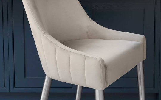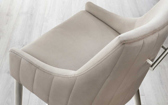 The Juliana bar stool brings sophisticated comfort to your kitchen island or breakfast bar. Upholstered in plush champagne velvet with distinctive vertical seams creating a ribbed texture, it pairs beautifully with sleek stainless steel legs. The curved backrest and horizontal bar handle combine style with practicality, making this the perfect perch for morning coffee or evening drinks.