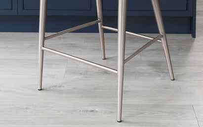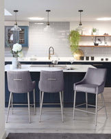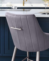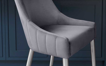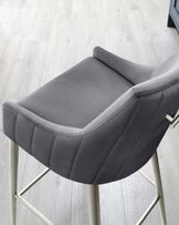 The Juliana dark grey velvet bar stool brings sophisticated style to your breakfast bar or kitchen island. Upholstered in plush velvet with vertical channel tufting, this fixed-height stool combines comfort with contemporary design. The gleaming stainless steel frame provides sturdy support while built-in floor protectors keep your floors pristine.