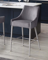Elegant contemporary bar stool with a smooth grey fabric upholstery, featuring a gently curved backrest and a comfortable seat. The chair has a sleek, supportive metal frame with a slender, four-legged base.