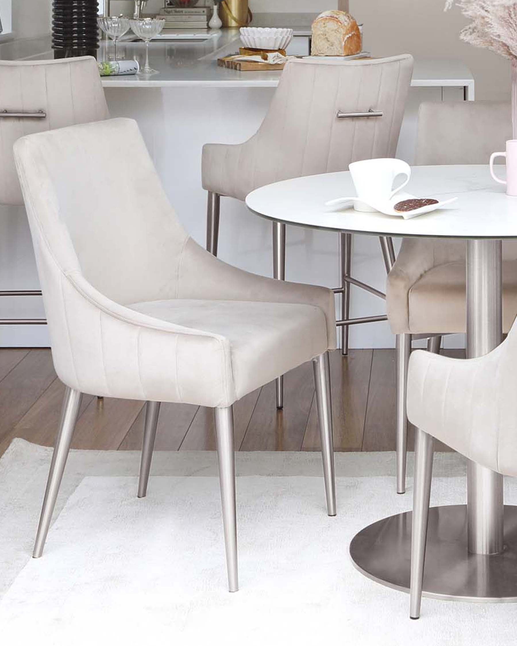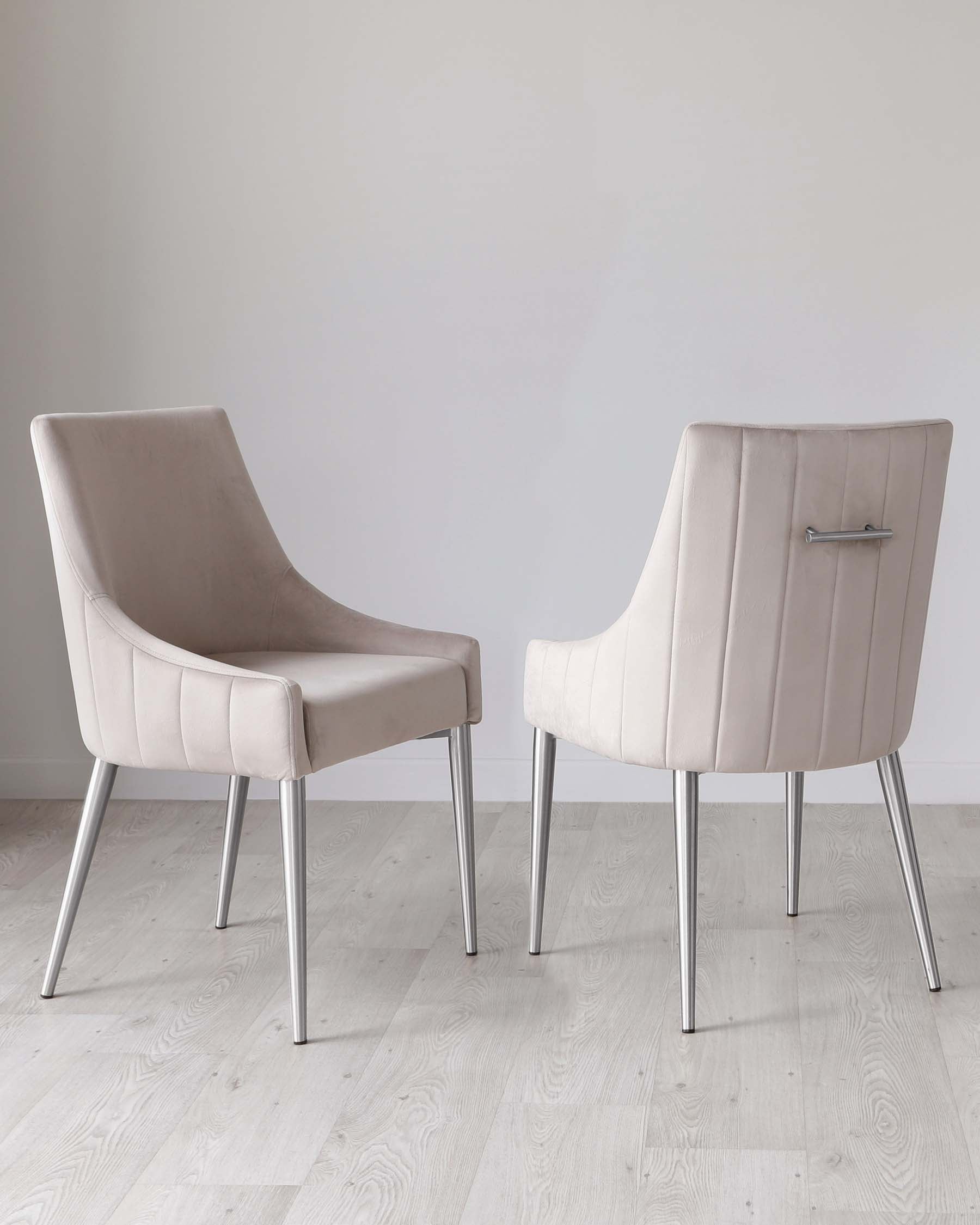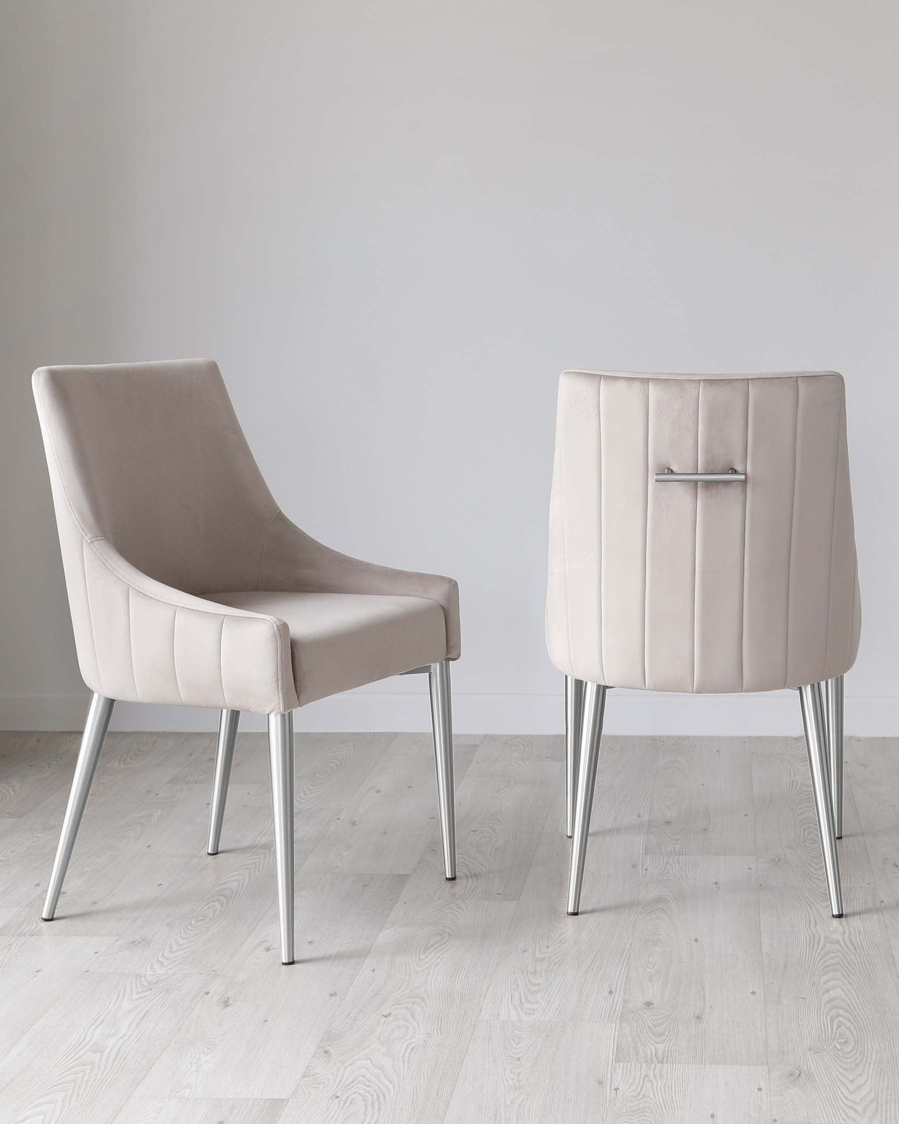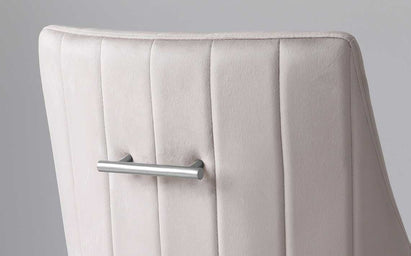 The Juliana dining chair brings sophisticated comfort to every meal. Upholstered in plush champagne velvet with vertical channel stitching, these chairs create an inviting atmosphere around your table. The brushed stainless steel legs provide sleek support, while the practical handle detail makes repositioning effortless. Sold in pairs, they're perfect for intimate dinners or larger gatherings.