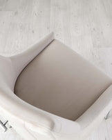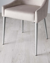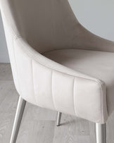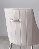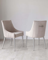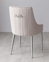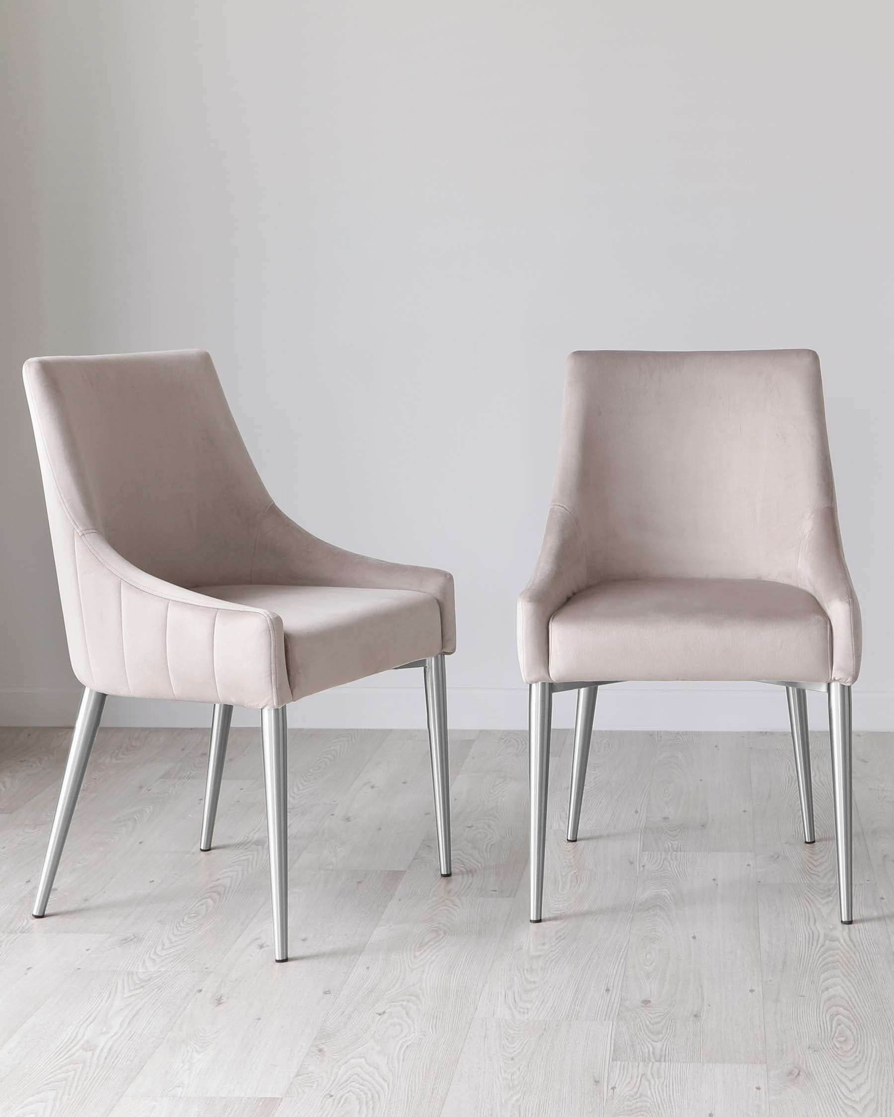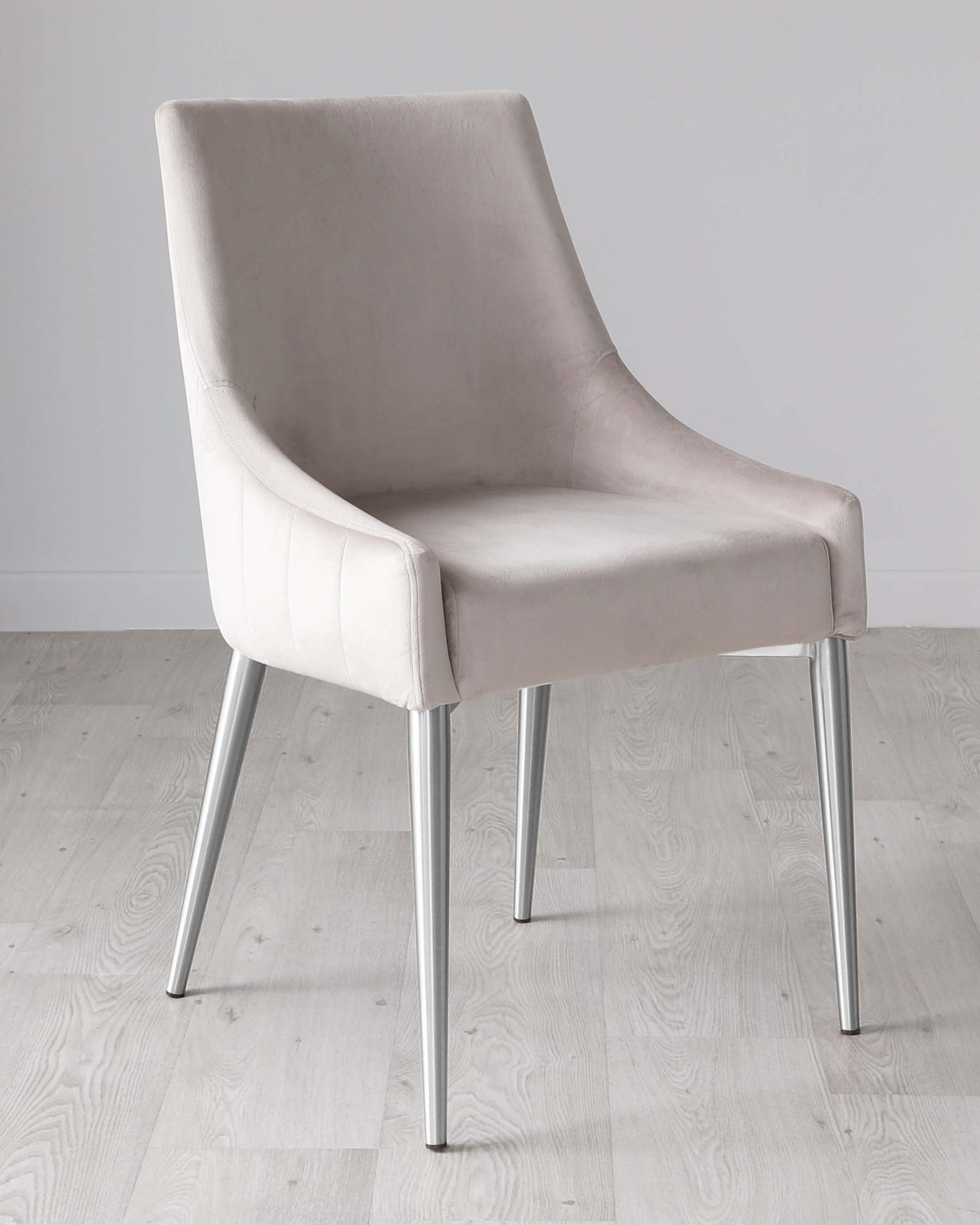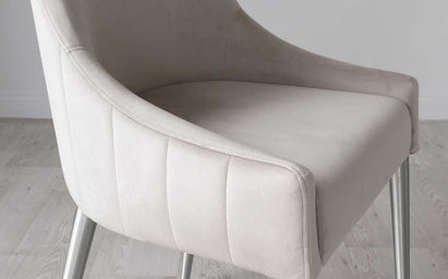 The Juliana dining chair brings sophisticated comfort to every meal. Upholstered in plush champagne velvet with vertical channel stitching, these chairs create an inviting atmosphere around your table. The brushed stainless steel legs provide sleek support, while the practical handle detail makes repositioning effortless. Sold in pairs, they're perfect for intimate dinners or larger gatherings.