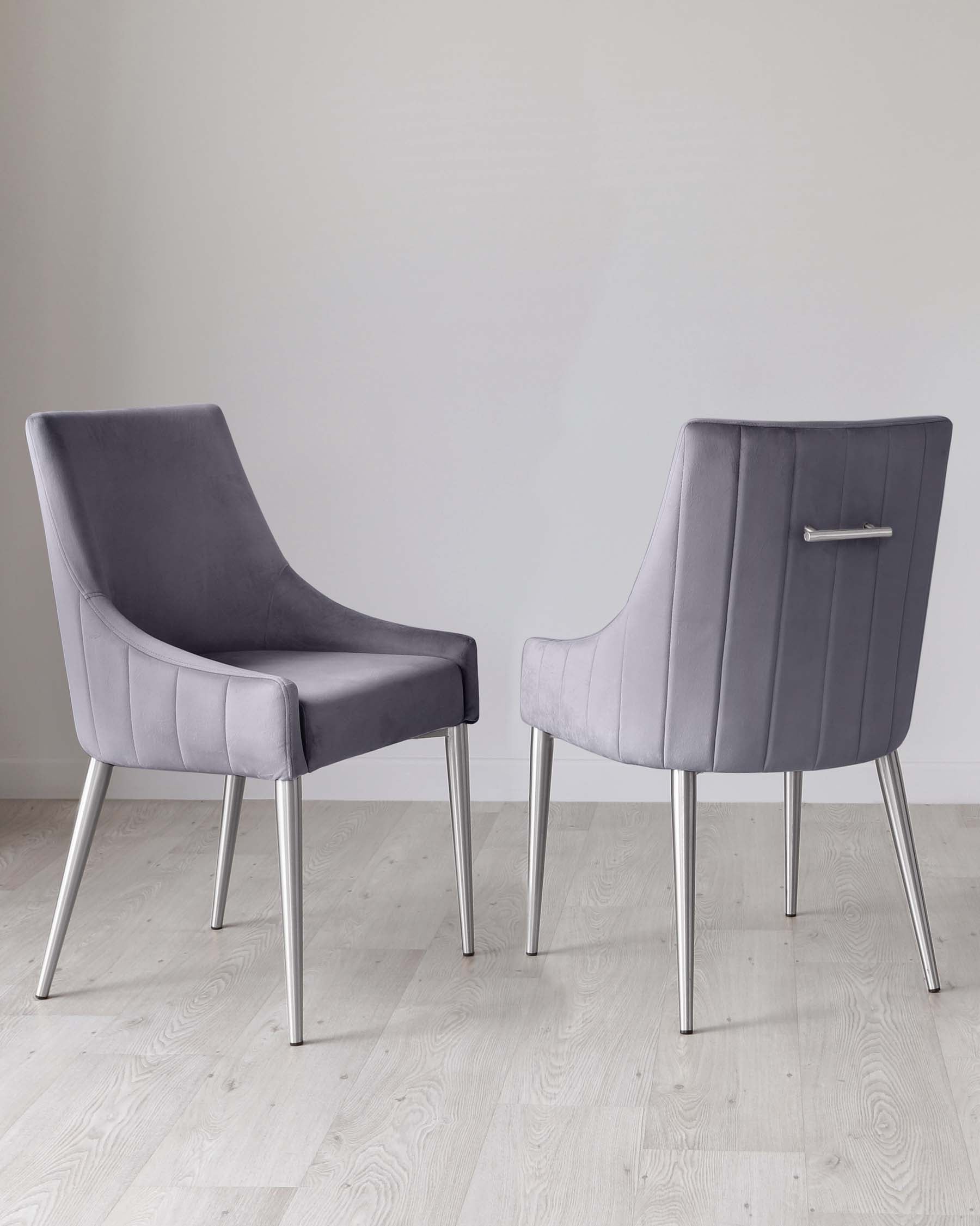 Make every meal feel like an occasion with the Juliana dark grey velvet dining chair. Sold in pairs, these chairs bring sophistication to your dining space with plush velvet upholstery and brushed stainless steel legs. The curved silhouette and textured detailing create visual interest, while the practical handle detail on the back makes positioning effortless.