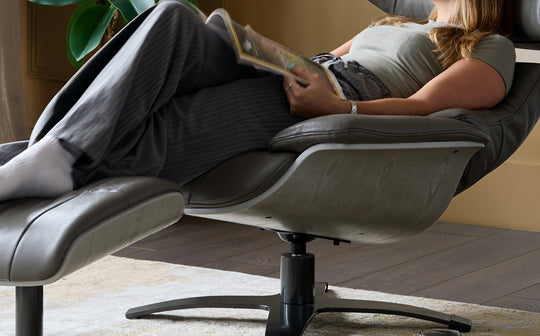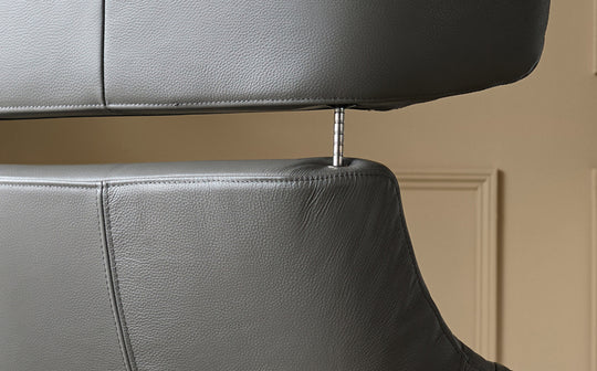 The Karma recliner redefines relaxation with its sophisticated blend of genuine dark grey leather and thoughtful engineering. This contemporary accent chair features a high-backed, winged design that cocoons you in comfort, while the smooth manual reclining mechanism and 360-degree swivel base adapt effortlessly to your needs. Complete with matching footstool, it's the perfect addition to create your personal retreat.