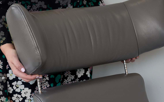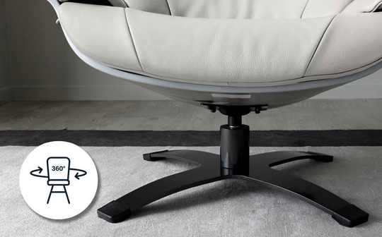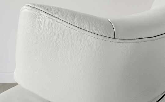 The Karma white leather swivel recliner redefines relaxation with its contemporary profile and thoughtful design. Upholstered in sumptuous real leather, this accent chair features a smooth reclining mechanism, 360-degree swivel base, and adjustable headrest for personalised comfort. Complete with a matching footstool, it creates the perfect retreat for reading, unwinding, or simply taking a moment for yourself.