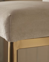 The Keira champagne velvet bar stool brings sophisticated seating to your kitchen island or breakfast bar. Plush champagne velvet meets brushed brass in this fixed-height design, featuring distinctive linear stitching across the gently curved backrest. The generously padded seat invites long conversations over morning coffee or evening aperitifs, while the sturdy brass frame provides reliable support for everyday use.