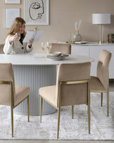 The Keira champagne velvet dining chair brings sophisticated comfort to your dining space. Upholstered in plush champagne velvet with eye-catching linear stitching, this chair combines luxurious texture with contemporary style. The brushed brass metal frame adds a glamorous touch while built-in floor protectors keep your floors pristine. Perfect for dinner parties that run late or quiet morning coffees.