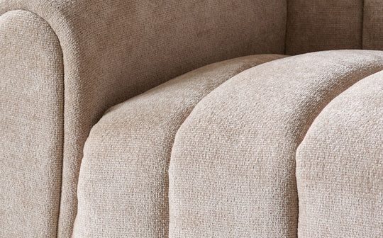 The Kendra natural fabric 3 seater sofa brings sculptural sophistication to your living space with its plump channelled panels and exaggerated vertical fluting. Upholstered in champagne-toned natural chenille, this statement piece offers all-day comfort with its generous proportions and waterfall edge design. The black metal legs add a grounded strength, creating the perfect anchor for relaxed evenings and weekend gatherings.