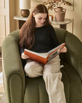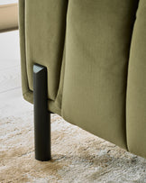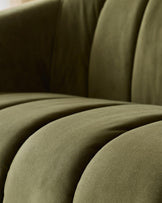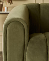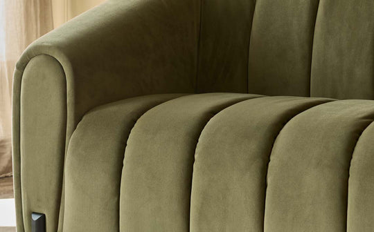 Effortlessly sophisticated, the Kendra olive green velvet armchair brings thoughtful design to your living space. Its distinctive vertical fluting creates dramatic texture, while plump panels offer sink-in comfort. The rich olive velvet against sleek black metal legs makes this exclusively designed piece perfect for reading corners, bedrooms, or as a statement accent in your hallway.