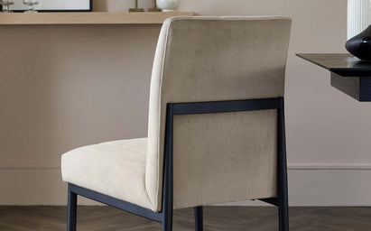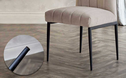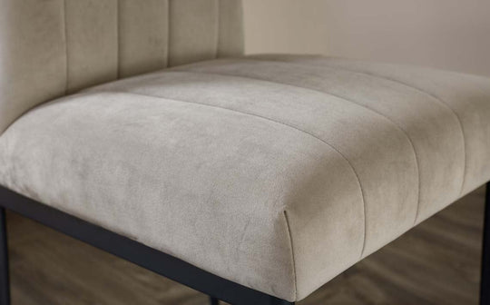 The Kendra dining chair brings sophisticated comfort to your dining space with its plush champagne velvet upholstery and sleek black metal frame. Perfect for both relaxed family meals and dinner parties, this beautifully crafted chair features meticulously stitched linear detailing that adds subtle texture and visual interest. The warm champagne tone creates an inviting glow whilst the striking black metal base provides contemporary contrast.