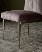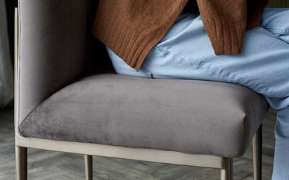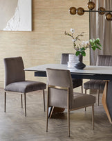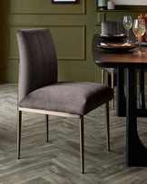 The Kendra dining chair brings sophisticated comfort to your dining space with its luxurious mocha velvet upholstery and striking brushed bronze frame. The plush cushioning and generous proportions make long dinner parties a pleasure, while meticulously stitched vertical channels add refined detail. Built-in floor protectors mean you can rearrange your dining setup without worry.