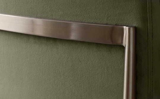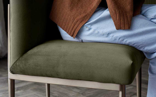 The Kendra olive green velvet dining chair brings sophisticated comfort to your dining space. Upholstered in sumptuous recycled velvet with meticulous linear stitching, this exclusively designed chair features brushed bronze legs that add contemporary flair. Sold in pairs, these cushioned seats create an inviting atmosphere perfect for long dinners and lively conversations around your table.