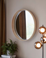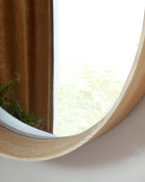 The Kendrick small round wall mirror brings understated elegance to any room with its beautifully crafted oak frame. The wide, smooth border showcases natural wood grain, creating a contemporary focal point that works perfectly above a console table, in bedrooms or hallways. Its circular design softens spaces while adding warmth and sophistication to your walls.