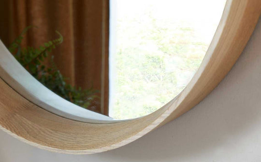 The Kendrick small round wall mirror brings understated elegance to any room with its beautifully crafted oak frame. The wide, smooth border showcases natural wood grain, creating a contemporary focal point that works perfectly above a console table, in bedrooms or hallways. Its circular design softens spaces while adding warmth and sophistication to your walls.