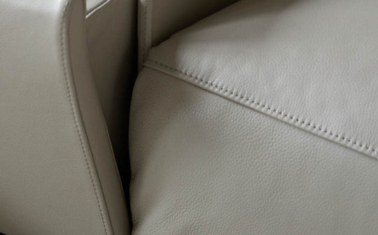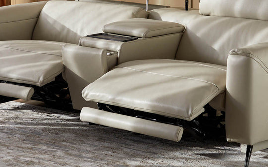 The Kenzie natural grey leather recliner 2 seater sofa brings cinema-quality comfort to your living room. Upholstered in luxurious genuine leather, this contemporary sofa features powered footrests and headrests that adjust to your perfect position. The integrated console table includes cup holders, wireless charging and adjustable LED lighting, making movie nights or quiet evenings equally indulgent.