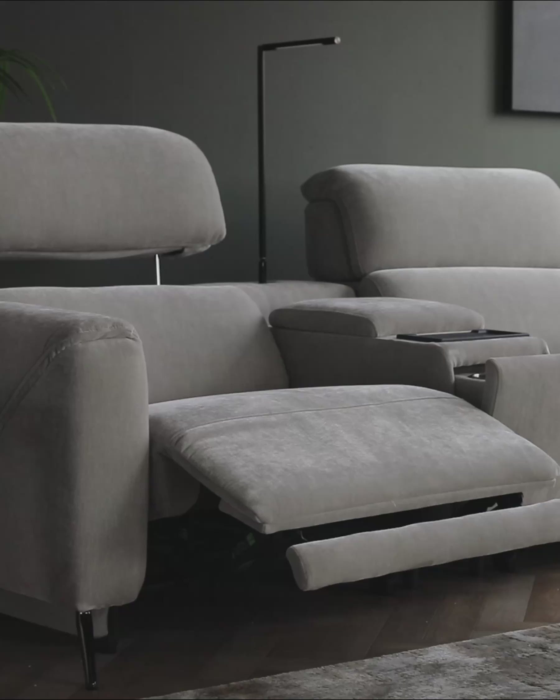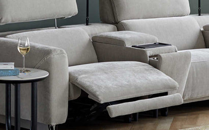 The Kenzie light grey fabric recliner 3 seater sofa brings cinema-level comfort straight to your living room. With powered headrests and footrests that adjust to your perfect position, this contemporary sofa makes movie nights and lazy Sundays even better. Its modular design means you can add a matching recliner chair with built-in side table, complete with cup holder, wireless charging and LED lighting.