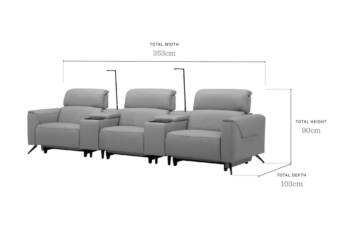 The Kenzie natural grey leather recliner sofa brings cinema-level comfort to your living room. With powered headrests and footrests for each of the 3 seats, plus a built-in console featuring cup holders, wireless charging and LED lighting, this is where film nights become an event. Genuine leather upholstery ensures both luxury and durability for years of relaxation.