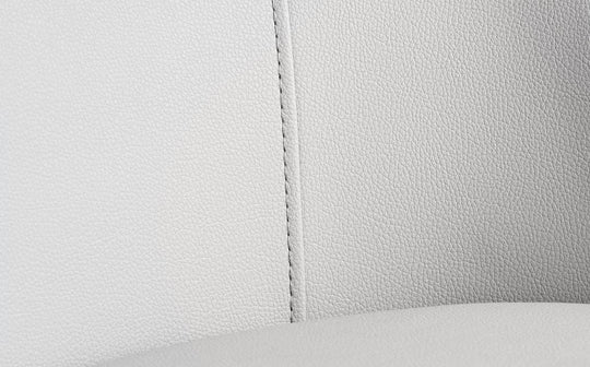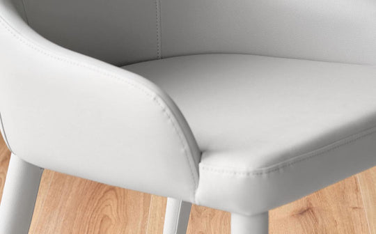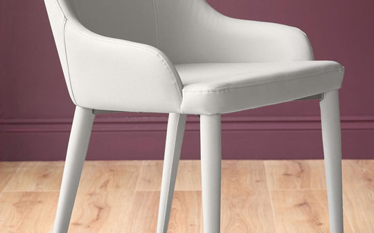 The Kyro light grey faux leather dining chair brings sophisticated comfort to your dining space with its generous curved back and subtle armrests that flow seamlessly into the seat. Fully upholstered in sumptuous light grey faux leather, this contemporary design features neat seam detailing and sleek steel legs that complement any dining table, from warm wood to sleek glass or industrial metal.