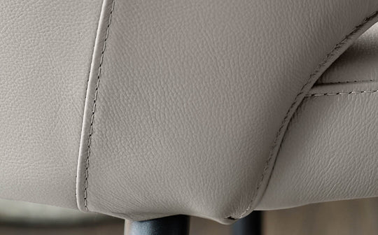 The Landon dining chair brings sophisticated comfort to every gathering. Upholstered in supple light grey real leather, its contemporary winged back design creates an inviting silhouette that works beautifully around both modern and traditional tables. The curved, wrap-around backrest provides excellent support, making those long dinner conversations even more enjoyable.