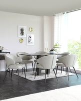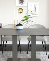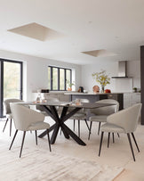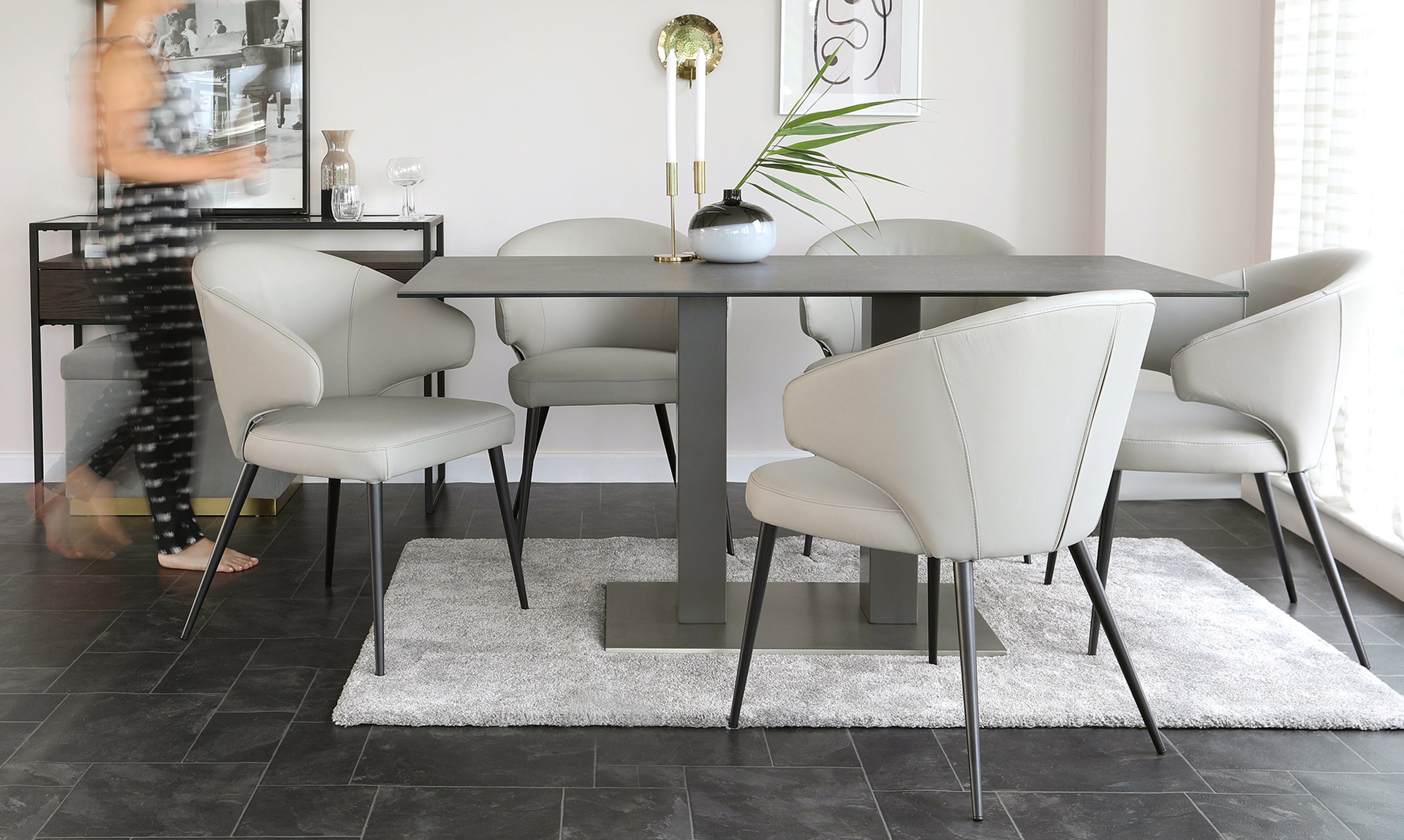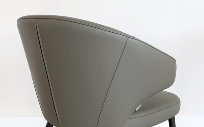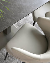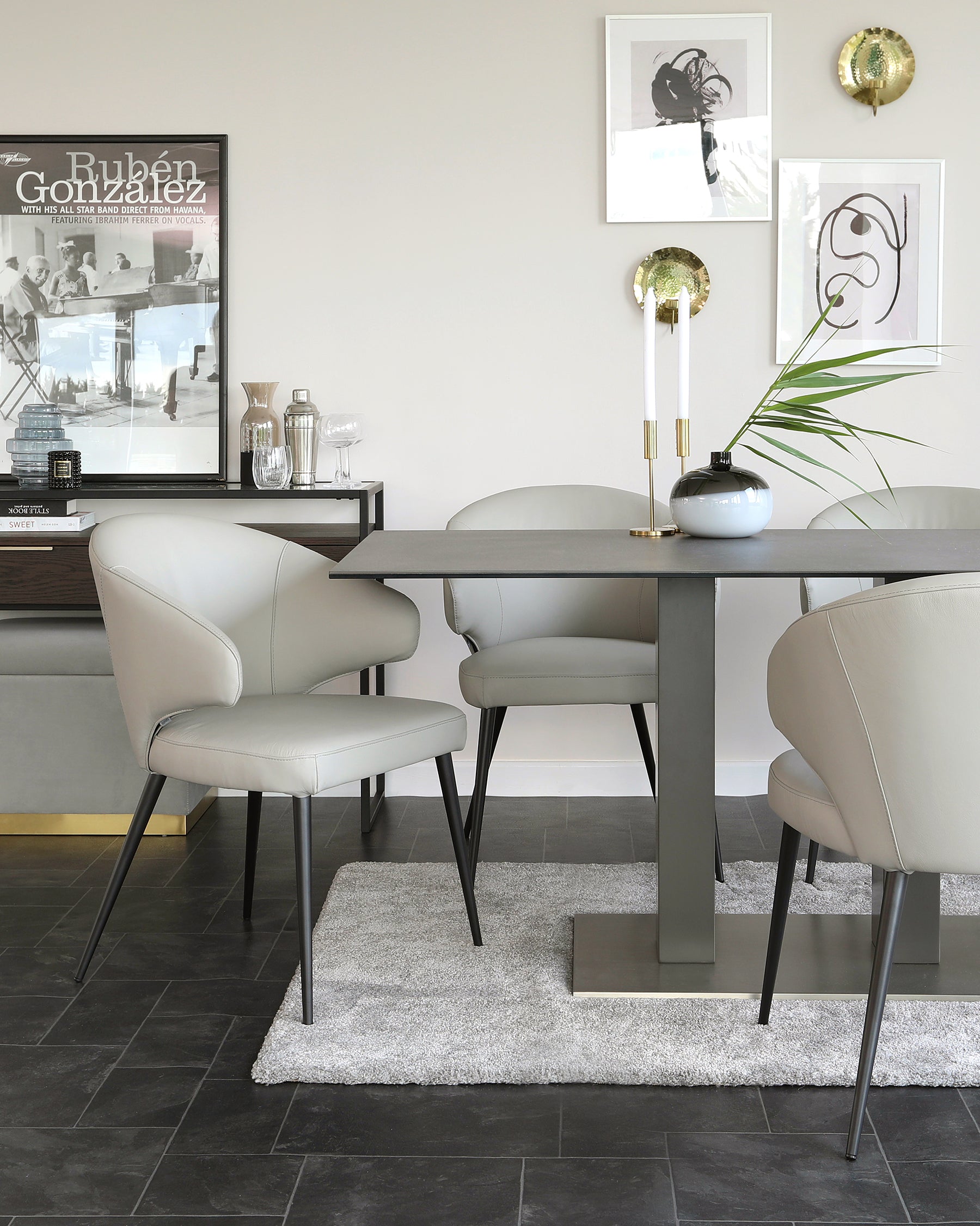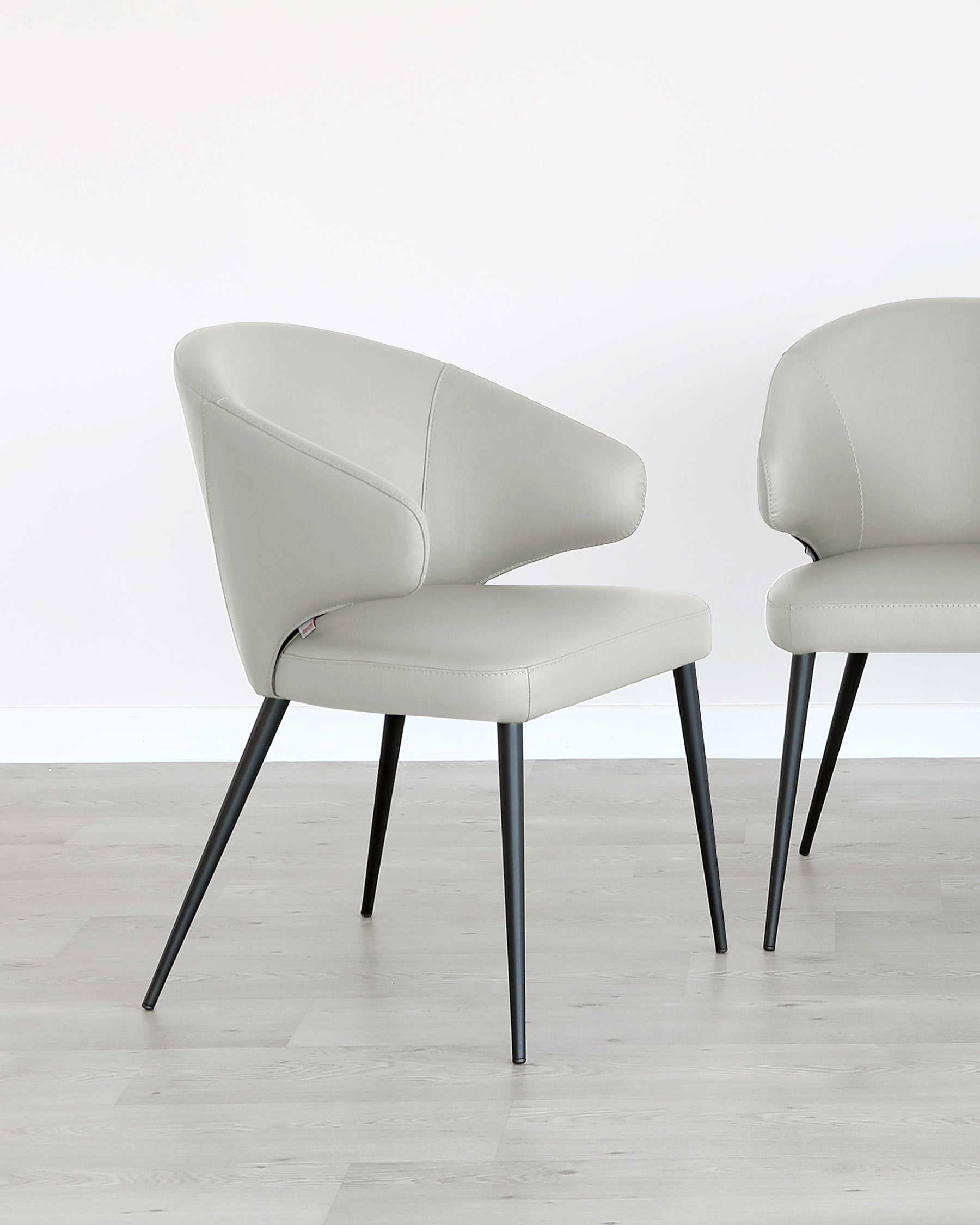 The Landon dining chair brings sophisticated comfort to every gathering. Upholstered in supple light grey real leather, its contemporary winged back design creates an inviting silhouette that works beautifully around both modern and traditional tables. The curved, wrap-around backrest provides excellent support, making those long dinner conversations even more enjoyable.