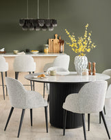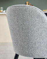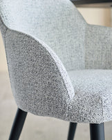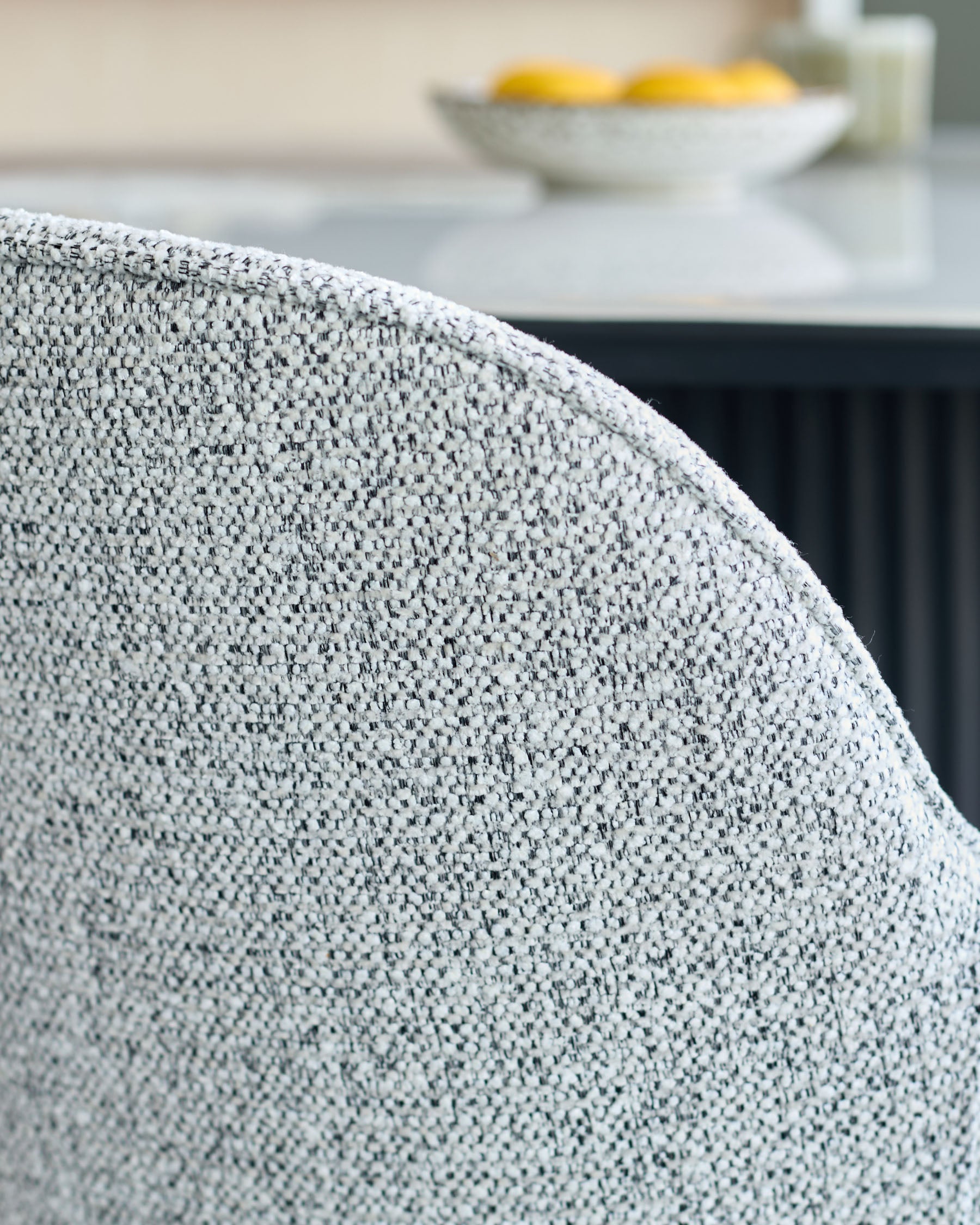 The Lani grey fabric dining chair brings comfort and style to every meal. Upholstered in soft grey salt-and-pepper chenille, this generously cushioned chair invites long dinners and lingering conversations. Slim tapered metal legs in a dark finish add sophistication, while curved armrests and backrest provide support exactly where you need it.